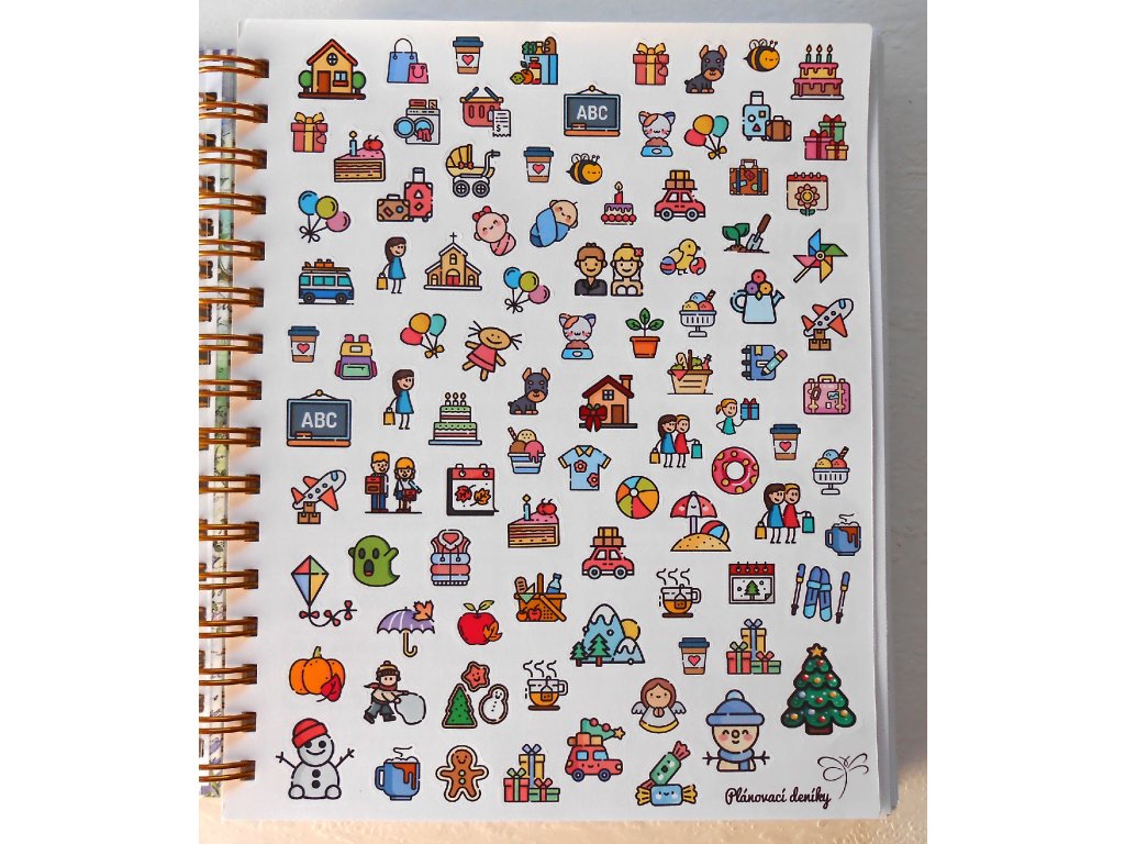Diáře obsahují 2 archy se spoustou veselých barevných samolepek. Na prvním archu jsou krásné dekorativní samolepky, které můžete využít k dekorování diáře v průběhu celého roku, na druhém archu najdete jednotlivé ikonky pro funkční plánování.