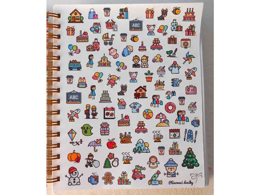 Diáře obsahují 2 archy se spoustou veselých barevných samolepek. Na prvním archu jsou krásné dekorativní samolepky, které můžete využít k dekorování diáře v průběhu celého roku, na druhém archu najdete jednotlivé ikonky pro funkční plánování.