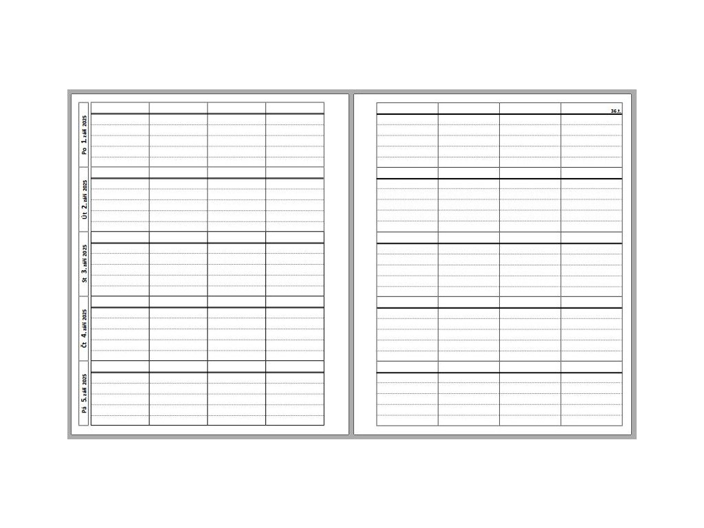 ♥ týdenní náhledy (každý týden na 2 stranách), dny rozdělené na vyučovací hodiny (8 vyučovacích hodin každý den)