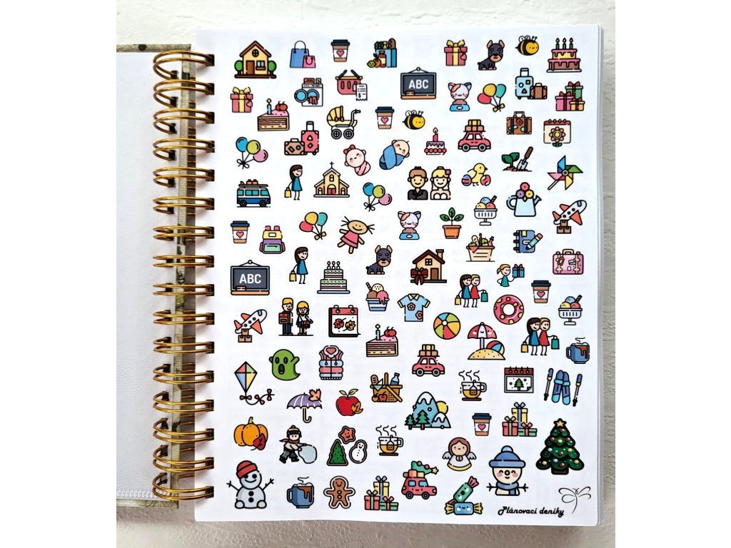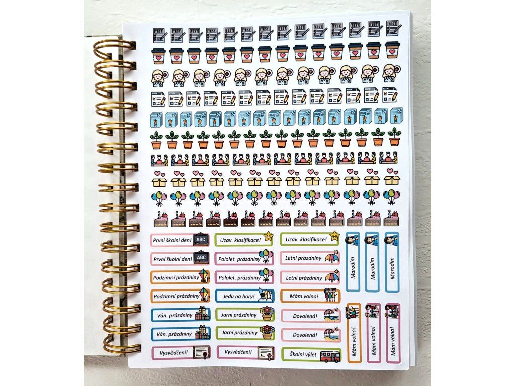 Diáře obsahují 2 archy se spoustou veselých barevných samolepek. Na prvním archu jsou krásné dekorativní samolepky, které můžete využít k dekorování diáře v průběhu celého roku, na druhém archu najdete jednotlivé ikonky či skripty pro funkční plánování.
